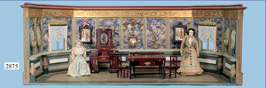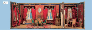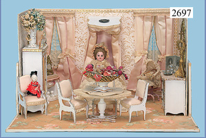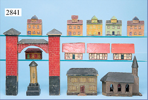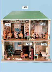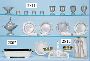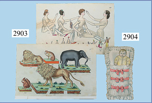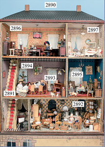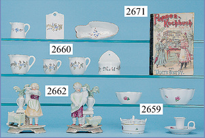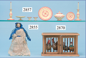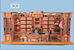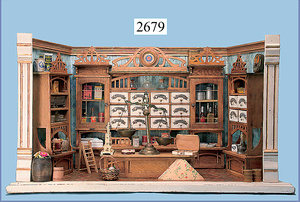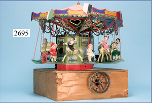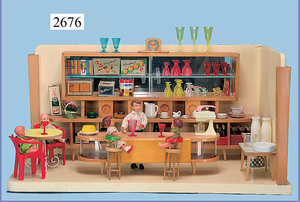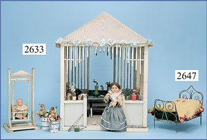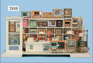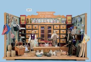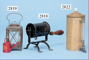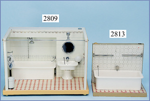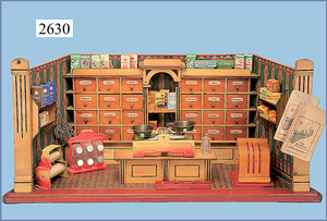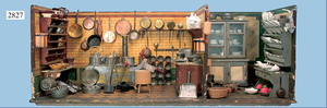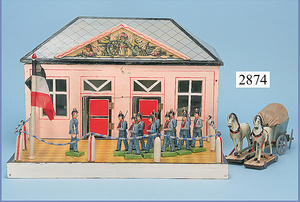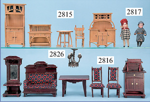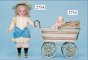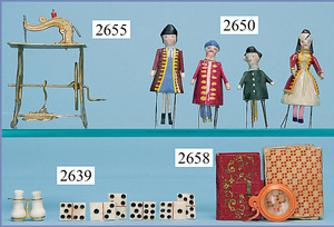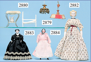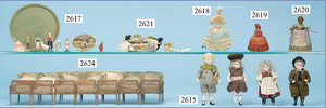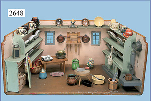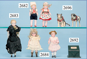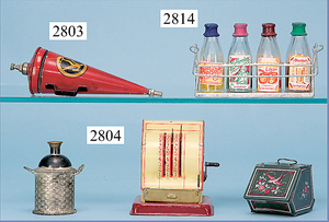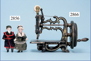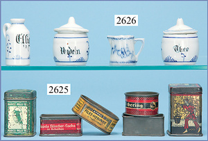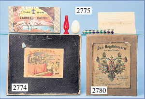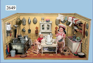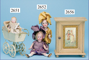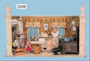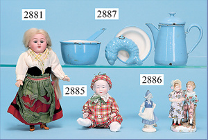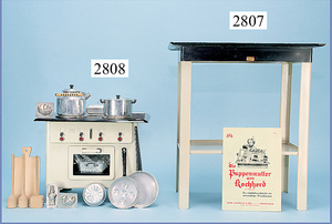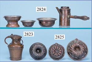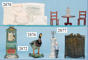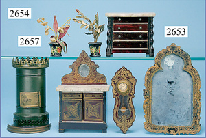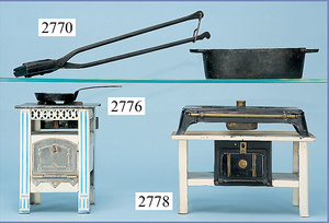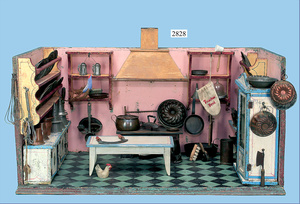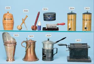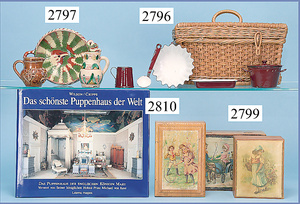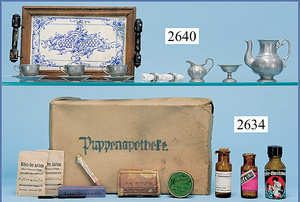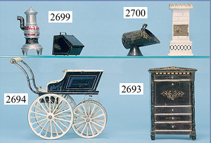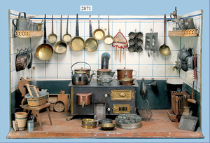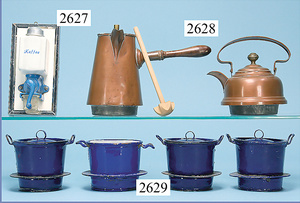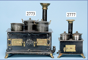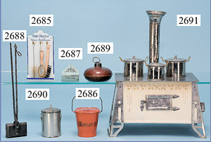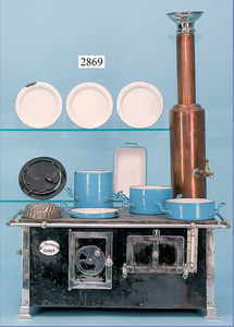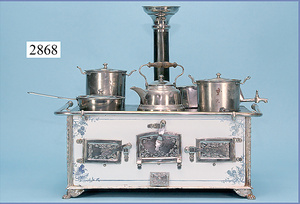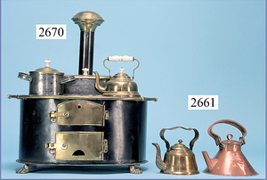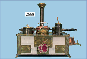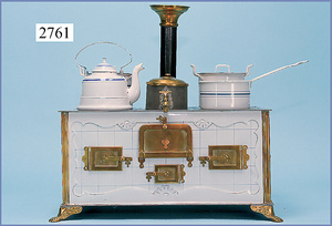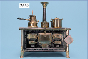 außergew. früher Puppenherd, möglicherw. Märklin, mit Wasserschiff gerechnet 60 cm breit, 31 cm hoch, Blech emailliert, Messing-Löwentatzenfüße, Messing-Galerie an der Deckplatte, außen liegendes Kupferwasserschiff, mit Messing-Hahn, 2 Töpfe Weißblech mit Messing-Deckel, Porzellan-Knaufe, 1 Weißblech Kakaokocher, mit Messing-Deckel, orig. dazu passend, Wasserschiff größenmässig genau dazu passend, farbl. passend zum Wasserschiff seitl. liegend, v Griffe anders, Wasserkessel ohne Randpartie am Boden, wohl passend, 1 Topf Knauf identisch, jedoch Messing orig.?, Emaileteile in sehr gutem Zust., 1 außergew. präsentnatives Museumsstück vor 1900