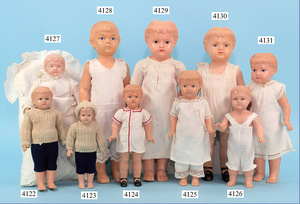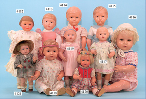 KÄTHE KRUSE Schaufenster-Puppe, Friedebald, 1,05 m, Magnesitkopf, mit Wimpern, schöne Orig.-Bemalung, Perücke mit Druckknöpfen, Draht in den Armen möglicherw. gebrochen, Stoff an den Fingern einwenig verschlissen, insges. guter Zust., schöne Bemalung, kl. Spannungsriss an einer Wange