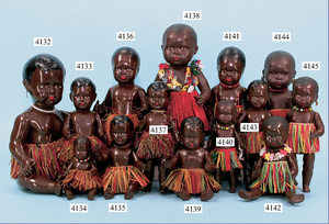 CELLBA Puppe, schwarz, Celluloid, 35/36, Kurbelkopf, braune fest eingesetzte Glasaugen, Celluloid-Stehkörper, Bastrock, Kette, sehr guter Zust.