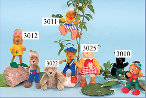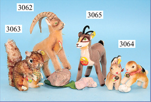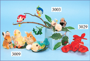 STEIFF, Konv. 4 Teile, 1x Küken, mit Knopf, Schild u. Fahne, guter Zust., 1x Eichhörnchen, mit Knopf, ein wenig bespielt, 1x Hase, mit Knopf u. Schild, 1x Goldfisch, mit Schild, Flossy, 5 - 10 cm