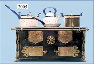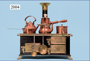 Puppenstuben-Herd, um 1900, Blech, Messing-Löwentatzenfüße, Türen, Griffstange, Messingumrandung der Deckplatte, Wasserschiff, Kakaokocher, Griff am Deckel später ergänzt, ohne Quirl, Kaffeekessel, Wasserkessel nicht orig., jedoch nahezu dazu passend, 31 cm breit
