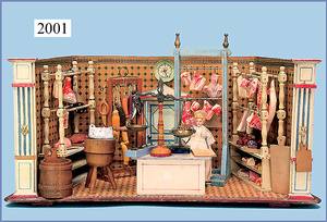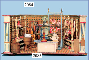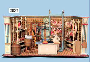 Puppenstuben-Metzgerei, 57 cm, wohl GOTTSCHALK, verzierte Frontleisten, Orig.-Kachelmustertapete an der Wand, fest eingebaute Regale, Säulen u. Stangen zum Aufhängen von Wurstwaren u. Fleischstücken, Tellerwaage mit gedrehtem Fuß, Hackklotz, Puppenstuben-Puppe als Metzgerin, reichhaltig Wurst- u. Fleischwaren, teils alt, einige möglicherweise neuer, hintere Tür ergänzt, 1 Leiste vorne fehlt, dekor.
