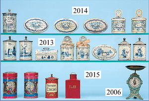 schönes Konv. Dosen, Blech lithogr., Holländermotiv, 2 runde Dosen mit Knauf, 6,5 cm, 2 rechteckige Dosen mit Knauf, 6 cm, 2 Brotdosen, kl. altersbedingte Lackfehler
