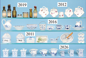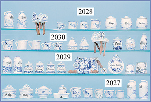 Puppenküchenporzellan, blaues Dekor, Löffelhalter, 1 Einsatz fehlt, 5 Milchkannen, Essigkaraffe, 2 kl. Metzen, 2 Gewürzdosen, davon 1 Deckel ergänzt