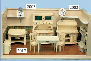 Puppenküche, ca. 1910, 84 cm breit, farblich überarbeitet, dazu interessantes Möbelprogramm, Schrankhöhe 32 cm, Kommode, Waschtisch, mit herausziehbarem Einsatz, Regal, 1 Wandregal u. Tisch, 1x überstrichen, schöne Gr.