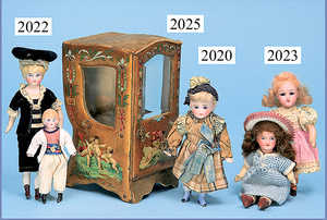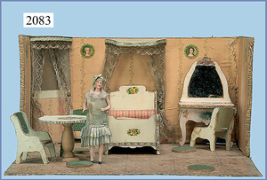 kl. franz. Reisepuppenstube, aufklappbar, ca. 1910, wohl GOTTSCHALK für den franz. Markt, 31 cm breit, 30 cm tief, 13 cm hoch, Orig.-Tapete, innen Ranken-, außen Reptilmuster, an den Wänden Oblatenschmuck, 5 kl. Frauenportraits, dazu 6-teiliges Schlafzimmer-Mobiliar, mit Goldspitzen verkleidete Kanten, Baldachin über dem Bett u. einem abgeschrägten Eckfenster, kl. außergew. Modepuppe, Biskuitbrustblattkopf, -arme u. -beine, Stoffkörper, Orig.-Kleidung, für die Zeit typisch angewinkelte Arme, schöne Gr., schöner Orig.-Zust.