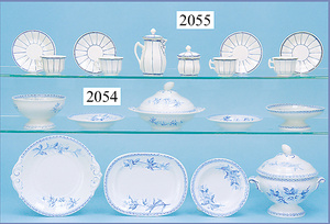 Konv. Porzellan, weiß, blaues Dekor, 3 Schüsseln, Backform, 4 Brettchen, für Puppenstube mittl. Gr., guter Zust.