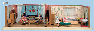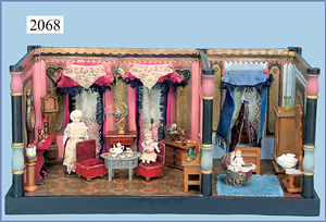 2-teilige Puppenstube, 87 cm breit, 42 cm tief, 39 cm hoch, 2 Fenster, Durchgang, mit gerafften Portieren, linke Seite alte Tapete neu tapeziert, rechte Seite Tapete Orig.-Jugendstil, rote Rosen auf weißem Grund, farbl. neu gefasst, möbliert mit Jugendstilmöbeln, Wohnzimmer, Schrank, Tisch, 2 Stühle, Kommode, umbautes Sofa mit Spiegelaufsatz, Schlafzimmer, Großmutter im Bett liegend, Biskuit-Brustblattkopfarme u. -beine, Stoffkörper, einige Porzellan- u. Glaszubehörteile