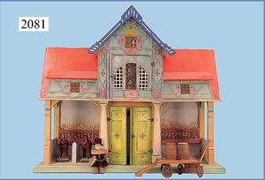 außergew. Puppenstuben-Stall, hochwertige Manufakturarbeit, Holz mit lithogr. Papier beklebt, Säulen handlackiert, seitlich Stallungen, mittig 2 Flügeltüren, Giebel mit Wohneinheit möbliert, Zubehör, Leiterwagen mit Fässern, Pferde Masse, kl. Biskuitpuppe, dekor., 69 cm breit, 82 cm hoch, 28 cm, tief