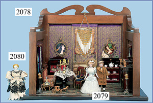 2-teilige Puppenstube, 2 Zimmer im altdeutschen Stil, 76 cm breit, 35 cm hoch, 34 cm tief, ca. 1880, 3 in Formenvielfalt aufwendig gestaltete Frontleisten, mit aufgesetzten Löwenköpfen, Salon u. Schlafzimmer rundum laufendes, schweres Eichengesims u. 1 aufwendig verzierte Vertäfelung im Salon, mit Sockel u. Profilleisten, Säulen, Kassetten u. Schnitzereien, ein paar Treppen mit reich ornamentiertem Geländer, gehören zu den eingetäfelten bleiverglasten Fenstern, vertäfelte Durchgangstür, mit Rahmen, Sitzgruppe, Samt bezogen, Höhe Rückenlehne ,mit geschnitztem Aufsatz u. Türmchen, aufwendig gearbeiteter Schrank, mit Galerien, Konsolen, Balustraden u. Drechseleien, Schlafzimmer, Bett, Spiegelschrank, Kommode mit Zinnbeschlägen, schöne Ausstrahlung, aus Museumsauflösung