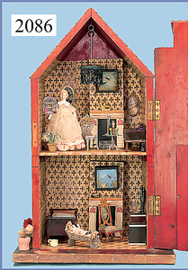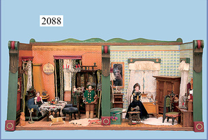 kl. dekor. 2-teilige Puppenstube, Biedermeier, 59 cm breit, 29 cm hoch, gedrehte Frontleisten, Durchgangstür, 3 Fenster, Tapeten u. Farben neuer, möbliert mit schönem Birnbaum- Möbelprogrammteile, Porzellan- u. Zinnteile, Deckenleuchter, Zinn-Puppenwagen, 2 Puppenstuben-Puppen
