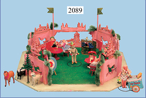 dekor. gearbeitetes Landschaftsteil als Zirkusszene, 49 cm breit, 49 cm tief, 20 cm hoch, Aussägearbeit, lackiert, mit reichhaltigem Zubehör, Stubenpuppen, Clownfigur, Kaspertheater, Kleinteile, zeitlich nicht einzuschätzen, da es sich hierbei um eine Bastelarbeit handelt