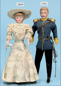 K & R, Puppenstuben-Puppe, 15 cm, Biskuitbrustblattkopf, gemalte Augen, Biskuitarme u. -beine, Stoffkörper, Kleidung alt o. aus alten Stoffen genäht, dazu Puppenstubenpuppen-Mann, 15 cm, Chauffeur, Biskuitbrustblattkopf, anmodellierter Schnurrbart, gemalte Augen, Biskuitarme u. -beine, Kleidung alt o. aus alten Stoffen genäht