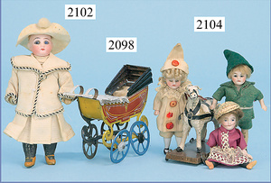 1-teilige Puppenstube, 67 cm breit, 43 cm hoch, 41 cm tief, Tapeten teilw. ergänzt, einige Leisten u. Verzierungen später, alte Vorhänge, möbliert, Tisch, Sofa, 2 Stühle, Schrank, Schreibtisch mit Ausschmückungsteilen, weihnachtliche Bescherungsszene, Puppenstuben-Mutter, 17 cm, Biskuitkopf, -arme u. -beine, Stoffkörper, Kleidung aus alten Stoffen genäht, Perücke neuer, Junge mit Zylinder, Stoffrumpf, Biskuitarme u. -beine, fest aufgenähte Kleidung, Zust. des Körpers kann nicht kontrolliert werden, kl. Ganzbiskuitmädchen, 11,5 cm, einige Geschenkausschmückungsteile, teils älter, teil neuer, dekor.