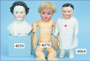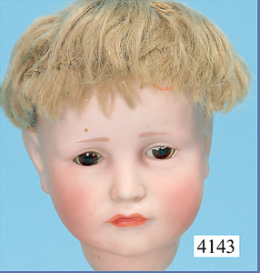 Biskuitporzellankopf-Puppe, ungemarkt, 22 cm, Kurbelkopf, blaue nachträglich fest eingesetzte Glasaugen, geschl. Mund, schöner ausgeformter Gliederkörper, 1 Daumen berieben, Körper leicht bespielt, mit kl. Reparaturstelle am Hals, Mohairperücke, am Kopfrand signiert 9302/0, schöner Ausdruck