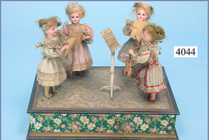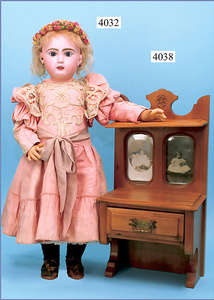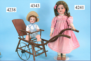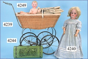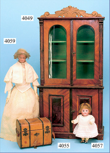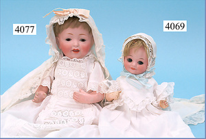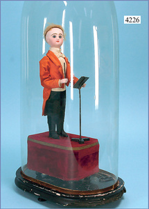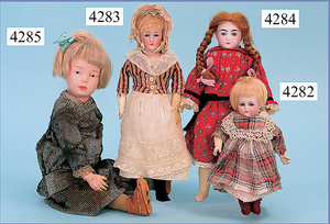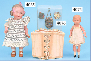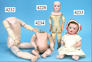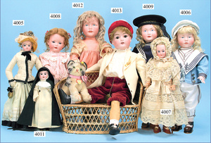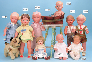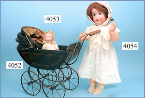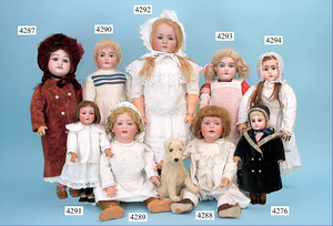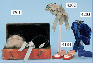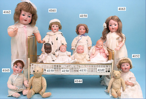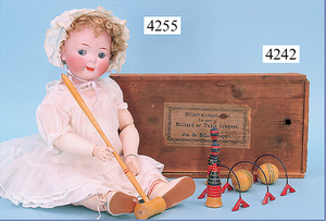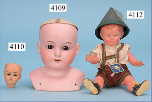 Max Oskar ARNOLD, außergew. Biskuitporzellankopf-Puppe, Arnola-Arnoldia, 54/14, 84 cm, Biskuitkopf, off. Mund, 4 Zähne oben, im inneren des Kopfes Schalltrichter zum Mund, 3 Schlitze im Hinterkopf, braune Schlafaugen, durchst. Ohrläppchen, brünette Perücke, Perücke neuer, Orig.-Gliederkörper aus Holz/Masse u. Papiermaché, mit Sprechmechanismus, durchlöcherter Kopfdeckel aus Blech, 1 Excelsior-Bakelit-Record-Walze, Quellennachweis: Ciesliks Lexikon der deutschen Puppenindustrie, Abbildung 39, alte Schuhe, Werk intakt, Trichter liegt lose bei, muß neu befestigt werden, dazu Orig.-Kurbel, sowie 1 zerbrochene Walze im Orig.-Kart., Orig.-Schlüssel