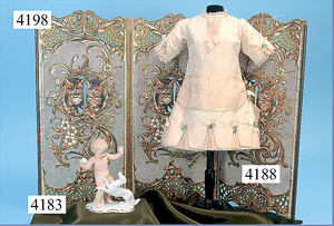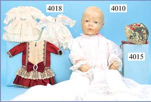 aufwendig gearbeitetes Puppenkleid, Seide bestickt, mit Spitze, dazu 2 Spitzenkleider, für ca. 30 cm Puppe, Seide an den Armen minim. gebrochen, sonst sehr guter Zust., alle neu aus alten Stoffen genäht
