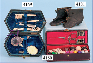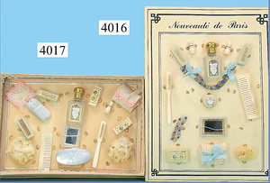Puppen-Toilettenset, Frankreich, Parfümflasche, Kamm, Bürste, Seife, Schwamm, Kleinteile, im Orig.-Kart., 14 x 20 cm