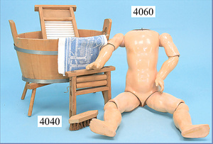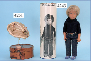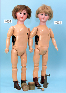 Max Oskar ARNOLD, außergew. Biskuitporzellankopf-Puppe, 54/14 Phonographen-Arnola-Arnoldia, Puppe, gemarkt 54/14, Biskuitkopf, ohne Kurbel, off. Mund, 4 Zähne oben, im inneren des Kopfes Schalltrichter, 3 Schlitze am Hinterkopf, blaue Schlafaugen, durchst. Ohrläppchen, blonde Mohairperücke, Perücke neuer, Orig.-Gliederkörper aus Holz/Masse u. Papiermaché, mit Sprechmechanismus, durchlöcherter Kopfdeckel aus Blech, 1 Excelsior-Bakelit-Record-Walze, 84 cm, Orig.-Schuhe, ohne Kleidung, techn. intakt, kl. ausgebesserte Stelle am Kniegelenk, kaum sichtbar, Perücke neuer, absolut selten, 1 Orig.-Schachtel für kl. Bakelitwalze, kl. ausgebesserte Stelle am rechten Ohr