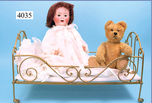 Puppenbett, schmiedeeisern, 73 cm, mit Himmel, Stoff neuer, dazu Biskuitporzellan-Charakterpuppe, ALT, BECK U. GOTTSCHALK, 1361, Gr. 55, braune Schlafaugen, off. Mund, Zähne, durchst. Nasenlöcher, Zunge liegt lose bei, ausgeformter Babykörper, 1 Finger fehlt, 1 Finger geklebt, Kleidung neuer, Perücke neuer
