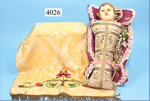Fatschenkind (sakrale Wachspuppe), im Steckkissen, 52 cm, braune Glasaugen, modellierte Haare, Kissen prunkvoll mit Perlen u. Brokat bestickt