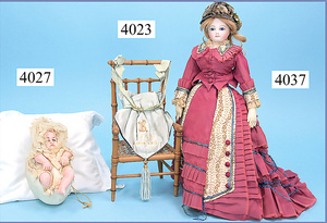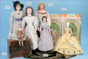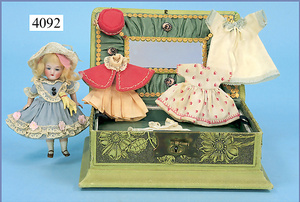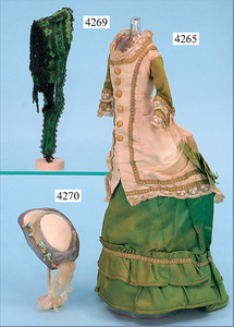 ausgef. Abendkleid mit Schleppe für 1 kl. Modepuppe, Frankreich um 1880, 2-teilig, grüner u. cremefarbener Seidensatin, Besatz aus Spitzen, Seidenband und Seidenborten, Seidenknöpfe, sehr schönes u. seltenes Orig.-Manufakturkleid einer Pariser Puppenfirma, für 1 ca. 36 - 38 cm Puppe, leicht verstaubt, Farbe an einigen Stellen verblasst, kl. Verschleißstellen am Oberteil, Länge vorn ca. 31 cm