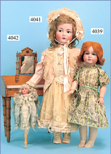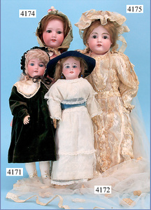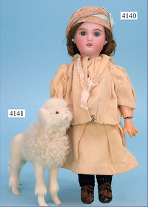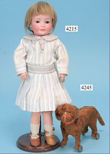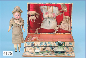 KESTNER, Biskuitporzellankopf-Puppe, Gr 14 1/2, braune Schlafaugen, off. Mund, Zähne, Kinngrübchen, schöner ausgeformter Gliederkörper in gutem Zust., Orig.-Gipsdeckel wurde nicht entfernt, Orig.-Mohairperücke, Versandrisiko beim Augenmechanismus beachten, Orig.-Kleidung u. Unterkleidung, sehr schöner Ausdruck
