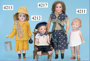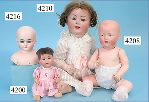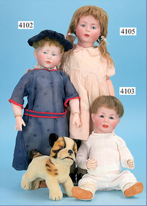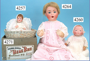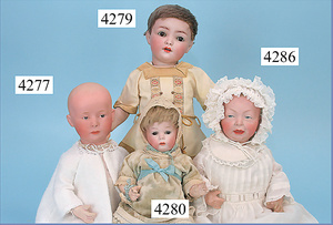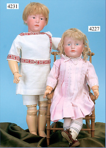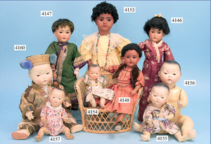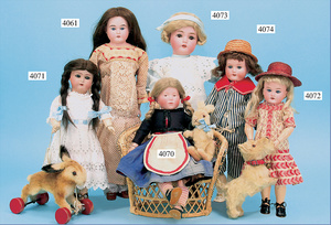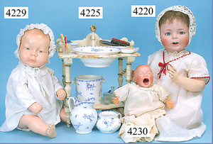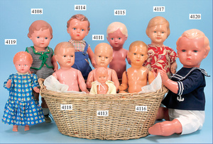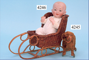 HERTEL,SCHWAB & CO., 141, Biskuitporzellan-Charakterbaby, Charakterbaby, 27 cm, braune Schlafaugen, off./geschl. Mund, Grübchen, ausgeformter Sitzbabykörper, mit untersch. Handhaltung u. untersch. Fußposition, sehr schöner Orig.-Zust., Mohairperücke ausgegangen, im Steckkissen u. Korb, sehr guter Zust.