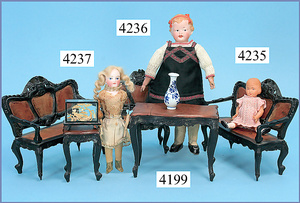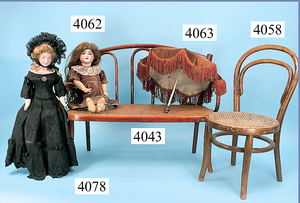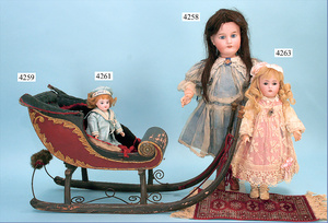 ausgef. früher Biedermeierschlitten, in Puppengr., 73 cm, Orig.-Lackierung, innen Samt gefüttert, Futter teilw. verschlissen, sehr schöner Orig.-Zust., museal