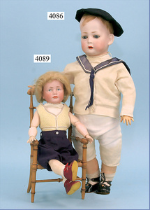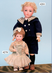 K & R, 111, Biskuitporzellan-Charakterpuppe, 49 cm, Kurbelkopf, graue Schlafaugen, geschl. Mund, alte Mohairperücke, ausgeformter Gliederkörper, alte Kleidung u. Schuhe, Orig.-Mohairperücke, sehr feine Modellierung, ausdrucksstark, eine der seltenen Charakterpuppen von KÄMMER & REINHARDT, Orig.-Matrosenkleidung
