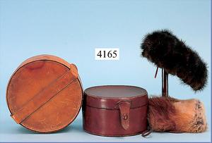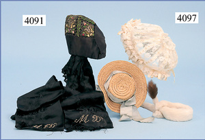 seltener Huret-Hut, Frankreich, um 1855-60, heller filz, graublauer Satin- u. Samtbesatz, Gazeschleier, Blütendeko, Seidenfutter gestempelt Huret Paris, der Hut stamm aus dem selben Trousseau wie die giftgrüne Habe, für 1 ca. 45 - 47 cm Puppe, leicht verstaubt, sonst sehr guter Zust.