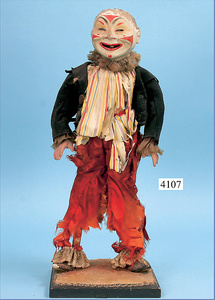 Biskuitporzellan-3-Gesichterpuppe, strafend, lachend, weinend, 42 cm, Stoffkörper mit gegliederten Holzarmen u. -beinen, eingebauter Zugstimme, alte Kleidung, guter Zust.