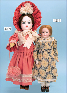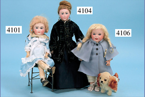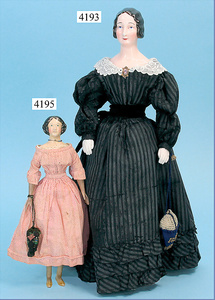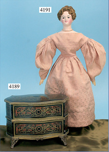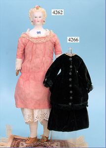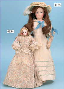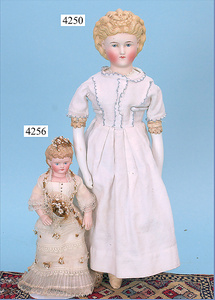 Biskuitporzellan-Brustblattkopf-Puppe, fein ausmodellierte Frisur, durchst. Ohren, gemalte Augen, geschl. Mund, Stoffkörper, Biskuitarme u. -beine, mit aufgemalten Schuhen u. Strümpfen, Orig.-Brautkleid, 22 cm, ausgef.