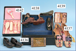 1 Paar frühe Puppenschuhe aus Seide, um 1830 - 40, schwarze Seide, Samteinfassung, Ledersohlen, Leinenfutter, leicht verstaubt, Seide am Sohlenrand etwas verschlissen, kl. Reparatur an 1 Schuh Bindebänder wohl später ersetzt, Länge ca. 10 cm,