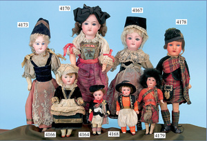 HERTEL,SCHWAB & CO., Biskuitporzellan-Charakterpuppe, gemarkt 151, 28 cm, braune Schlafaugen, geschl. Mund, Masse-Stehkörper, mit untersch. Handhaltung u. dickem Bauch, alte Mohairperücke, alte Kleidung, 1 Auge sitzt etwas tief