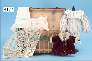 Trousseaukoffer, 51 cm lang, 29 cm breit, reichhaltig gefüllt, ca. 50 Teile Weißwäsche, Strümpfe, Spitzen, kl. Puppenfächer, Handschuhe, ca. 1900 - 1920 ( n. a. T. f. )