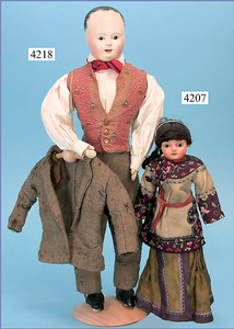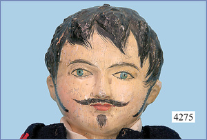 früher Biedermeier Puppen-Mann, Holz-Brustblattkopf, blaue gemalte Augen, ausgeschnitzte Haare, Lederkörper, ca. 1830, 58 cm, seltenes Museumsstück