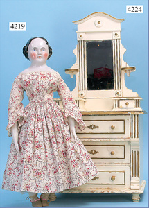 außergew. damenhafte Biskuitporzellan-Brustblattkopf-Puppe, 31 cm, blaue fest eingesetzte Glasaugen, geschl. Mund, durchst. Ohren, Lederkörper, 1 Hand Daumen fehlt, alte Kleidung, alte Schuhe, schöne Mohairperücke, mit außergew. Frisur
