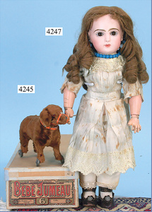 Tête Jumeau, Biskuitporzellankopf-Puppe, Frankreich, roter Stempel, 72 cm, blaue fest eingesetzte Glasaugen, off. Mund, Zähne, aufgesetzte Ohren, durchst., 73 cm, Brandlinie am Kopf innen, nicht bis zur Glasur außen, an der Kurbel, franz. Gliederkörper, alter Korkdeckel, Mohairperücke, alte Kleidung u. Schuhe, Hände farblich überarbeitet