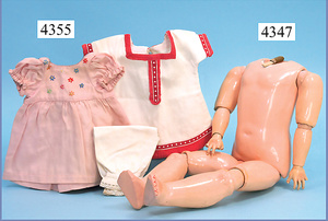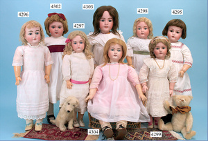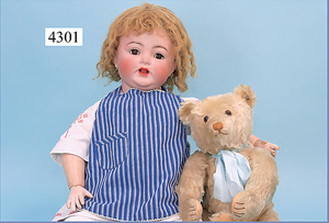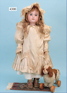Biskuitporzellankopf-Puppe, gemarkt 192, 75 cm, blaue Schlafaugen, off. Mund, oben Zähne, Kinngrübchen, durchst. Ohren, auf frühem ausgeformten Gliederkörper, mit 6 losen Kugeln u. festen Handgelenken, 75 cm, alte Schuhe, Perücke neuer, ausdrucksstark