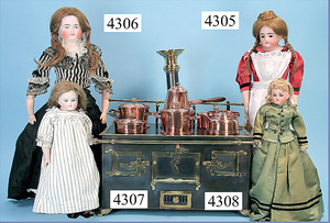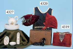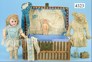 S & H, 939, Trousseau-Koffer, mit Biskuitporzellankopf-Puppe, SIMON & HALBIG für den franz. Markt, 27 cm, Kurbelkopf, braune Schlafaugen, off. Mund, oben Zähne, durchst. Ohren franz. Gliederkörper, reichhaltig Trousseau-Teile, kl. Masse-Stehpuppe, 10,5 cm, aufwendig gearbeitete Tasche, Messingblech vergoldet, 1 Mantel, Seide stärker verschlissen, Länge Trousseau-Koffer 30 cm