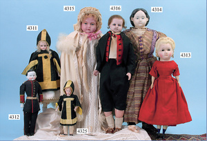 GREINER, gr. Papiermaché-Brustblattkopf-Puppe, ca. 1860, 75 cm, stark ausmodellierte Frisur, Stoffkörper, Lederunterarme mit abgenähten Fingern, schönes altes Kleid, Unterkleidung, alte Schuhe, Nase, Kinn u. Brustblatt etwas ausgebessert, Kleid an einigen Stellen altersbedingt verschlissen