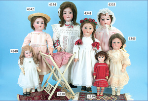 SIMON & HALBIG, 1079 Dep., Biskuitporzellankopf-Puppe, Gr. 14, 75 cm, braune Schlafaugen, off. Mund, oben Zähne, Kinngrübchen, durchst. Ohren, schöner ausgeformter Gliederkörper in sehr gutem Zust., alte Kleidung, alte Schuhe, alte Perücke