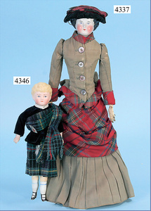 ALT, BECK & GOTTSCHALCK, Biskuitporzellan-Brustblattkopf-Puppe, 25 cm, blonde stark ausmodellierte Haare, blaue gemalte Augen, geschl. Mund, Stoffkörper, Biskuitarme u. -beine, Schottenkleidung