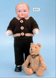 außergew. Wachspuppe, Junge, Brustblattkopf, blaue fest eingesetzte Glasaugen, geschl. Mund, eingesetztes Haar, Stoffkörper, Wachsarme u. -beine, alte Jungenkleidung, an kl. Stellen etwas verschlissen, 66 cm