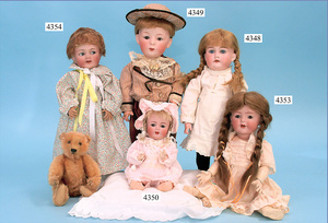 SIMON & HALBIG, 949. Dep 7 1/2, , außergew. ausdrucksstarke Biskuitporzellankopf-Puppe, Biskuitkurbelkopf, braune fest eingesetzte Glasaugen, off. Mund, Porzellanzähne, franz. Gliederkörper, stärker bespielt, mit Farbabrieb u. Masseabplatzern, teilw. alte ausgebesserte Stellen am Körper, 80 cm, ein besonderer Ausdruck, Perücke neuer, alte Kleidung, alte Kinderschuhe, für den franz. Markt