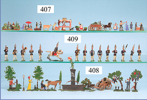 gr. Konv. Zinnfiguren, plastisch, 5,5 cm, Reiter, marschierende, Musiker, Kutschen, Lackierung Alter?, einige Ausschmückungsteile, Bäume, Büsche