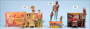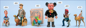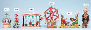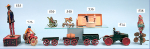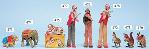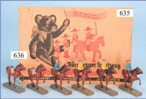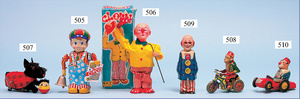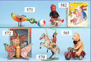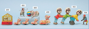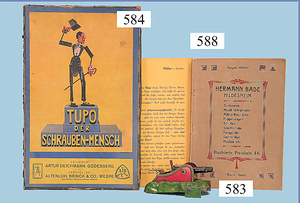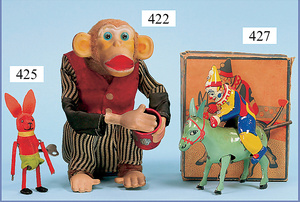 BLOMER & SCHÜLER, Clown auf Esel, Blech lithogr., US-Zone, im Orig.-Kart., Kart. verschlissen, Spielspuren am Esel, sonst guter Zust.