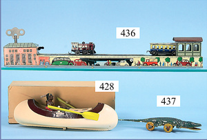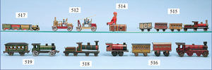 BING, Spur 0, 2B, Vorläufer fehlt, Uhrwerk, dazu 2 Personenwagen, 2-achsig, bespielt