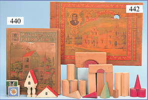 FROEBELS, Bauschule, Holzbaukasten, Friedrich Fröbel gründete 1839 in Blankenburg, Thüringen, den ersten Kindergarten um die Entwicklung der Kinder zu fördern, deren Eltern schon damals in der Industrie beschäftigt waren, auch der Name Kindergarten ist eine Erfindung Fröbels, er wurde in keine andere Sprache übersetzt, sondern übernommen, ca. 1850, Holzkasten mit Holzbausteinen, wohl weitgehend kompl., ohne Anleitung, lithogr. Deckbild, mit Abbildung von Friedrich Fröbel, Deckbrett 1x gerissen, schöner Orig.-Zust.